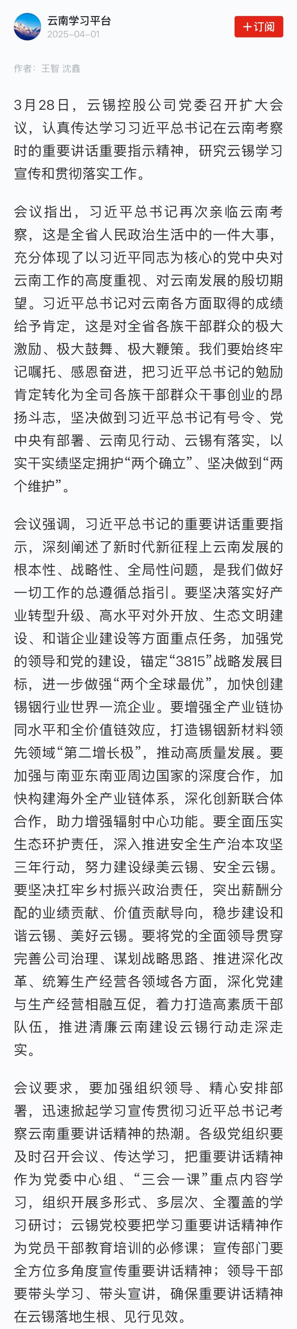 學(xué)習(xí)強(qiáng)國(guó):云錫控股公司黨委召開(kāi)擴(kuò)大會(huì)議 認(rèn)真?zhèn)鬟_(dá)學(xué)習(xí)習(xí)近平總書(shū)記考察云南重要講話重要指示精神