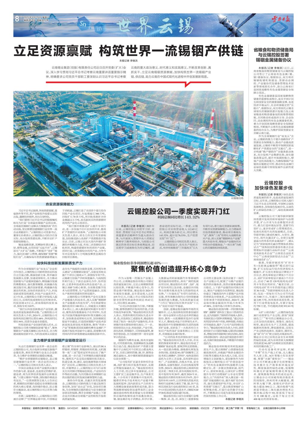 作為全球錫銦行業(yè)“雙龍頭”企業(yè),云錫始終致力于提升戰(zhàn)略性礦產資源安全保障能力,推動產業(yè)鏈高質量發(fā)展。云錫將不斷筑牢保障國家戰(zhàn)略性礦產資源安全的“壓艙石”,進一步構建“購產儲銷存”全鏈條聯(lián)動體系,充分發(fā)揮產業(yè)集群優(yōu)勢,深化儲備政策運用,提升市場調控能力,增強產業(yè)抗風險能力,為確保錫銦產業(yè)鏈供應鏈穩(wěn)定可控、推動有色金屬行業(yè)綠色低碳可持續(xù)發(fā)展作出新的更大貢獻。