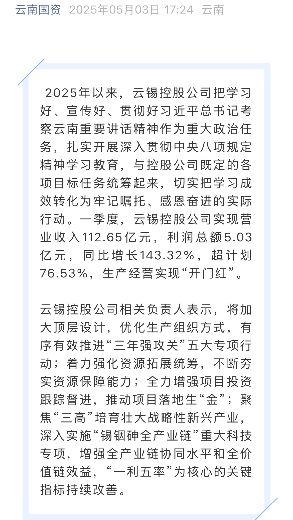 云錫控股公司一季度實現(xiàn)開門紅——利潤總額同比增長143.32%