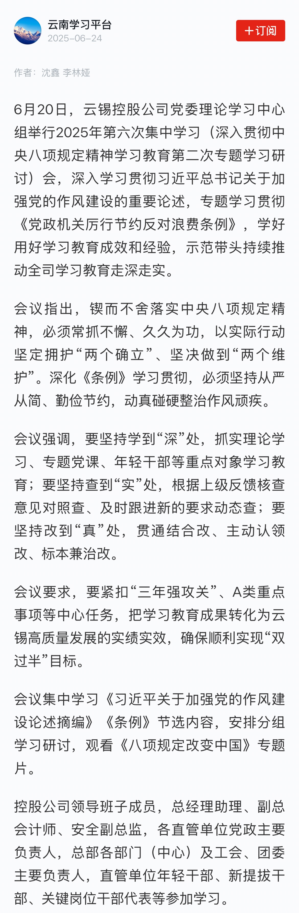 學(xué)習(xí)強(qiáng)國(guó):云錫控股公司黨委理論學(xué)習(xí)中心組舉行深入貫徹中央八項(xiàng)規(guī)定精神學(xué)習(xí)教育第二次專題學(xué)習(xí)研討
