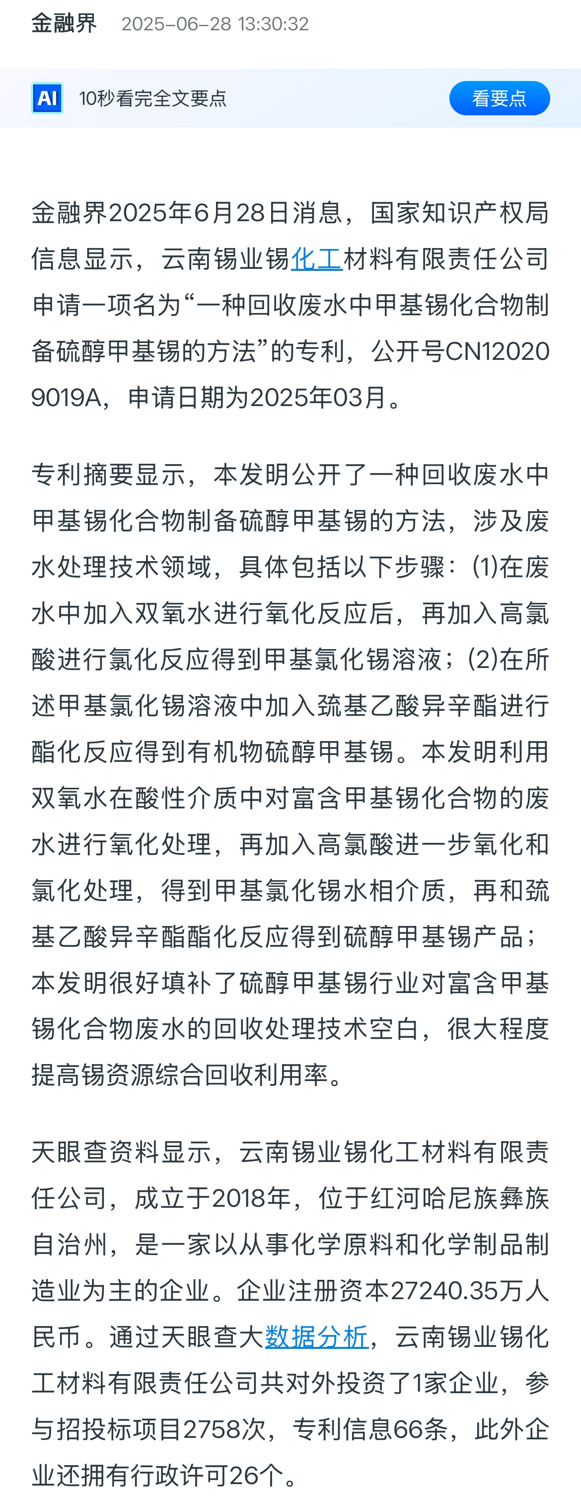 金融界:云南錫業(yè)申請(qǐng)回收廢水中甲基錫化合物制備硫醇甲基錫專利,填補(bǔ)硫醇甲基錫行業(yè)對(duì)富含甲基錫化合物廢水的回收處理技術(shù)空白