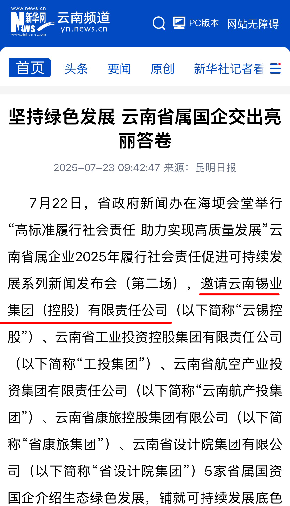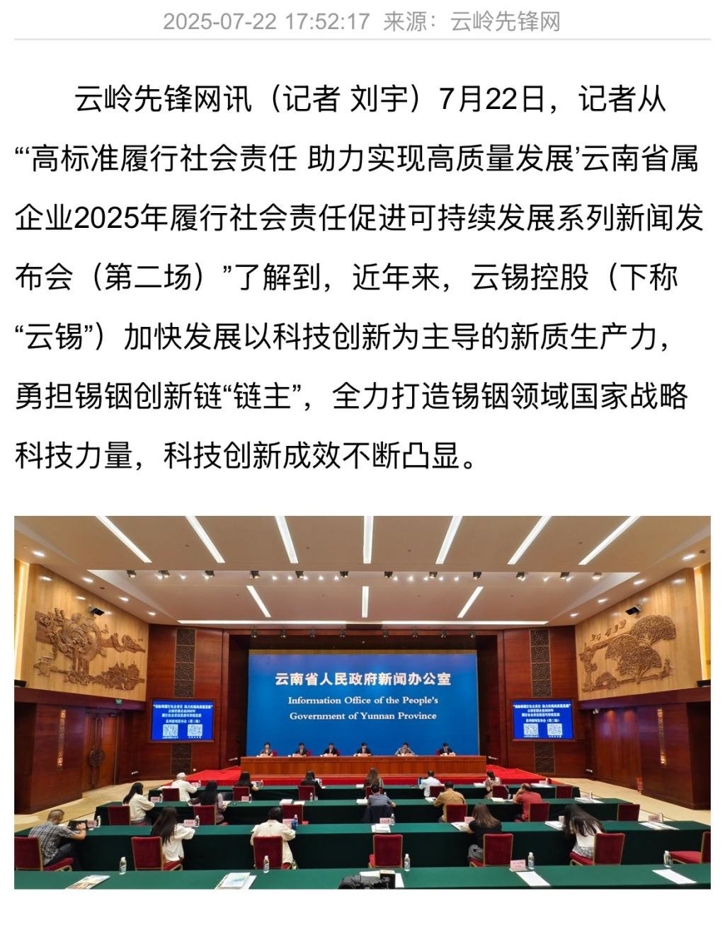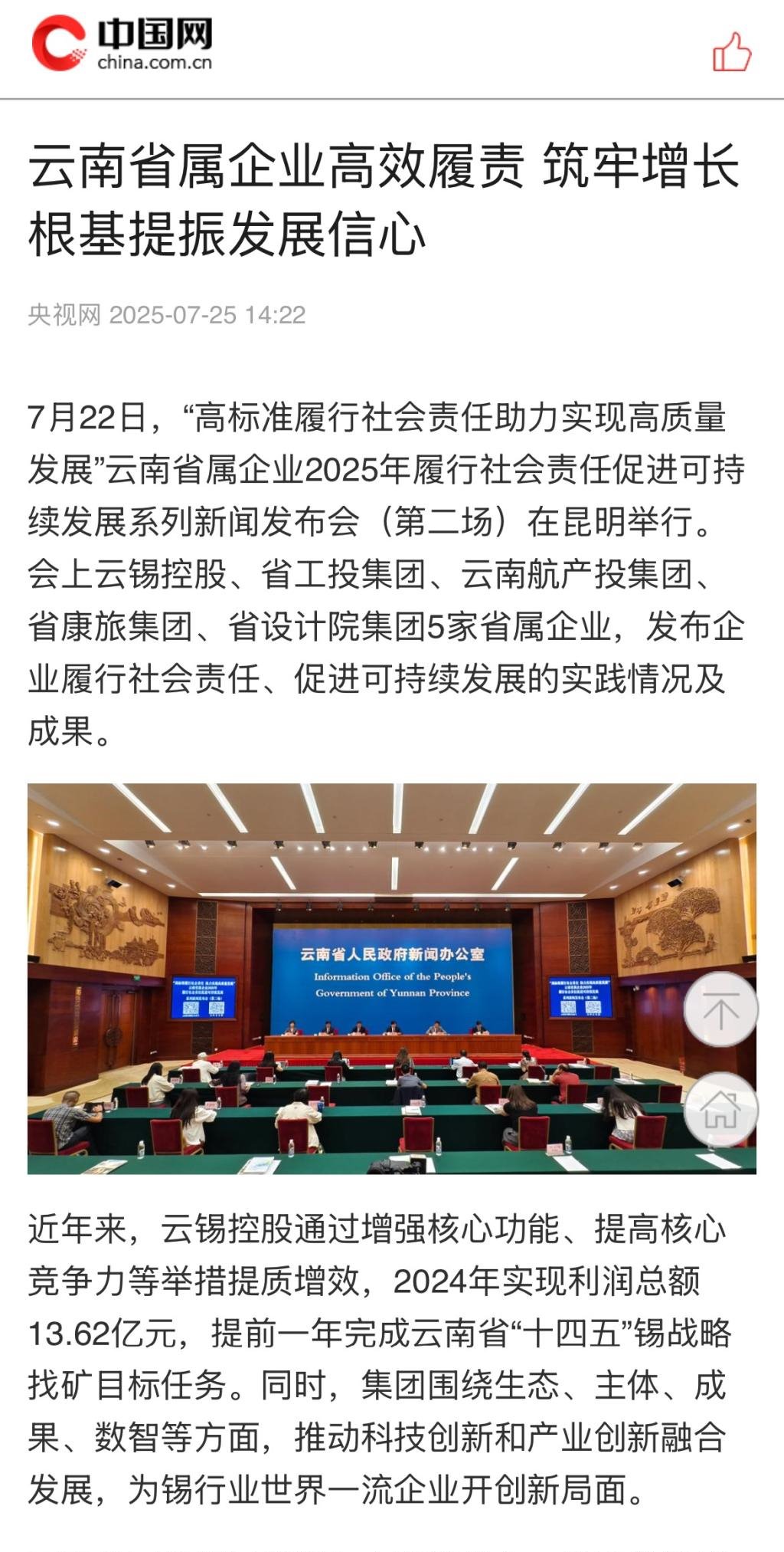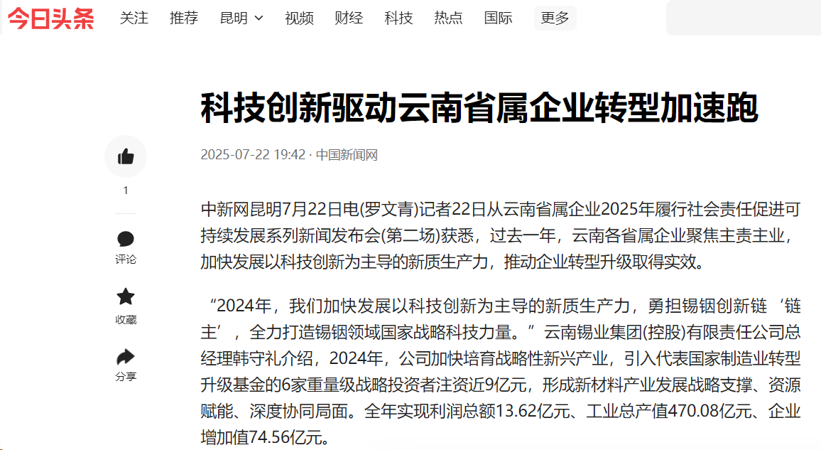 鏈接:(央廣網(wǎng))、(央視影音)、(新華網(wǎng))、(新華時訊)、(中國日報網(wǎng))、(中國新聞網(wǎng))、(中國網(wǎng))(云南新聞聯(lián)播)、(云南衛(wèi)視晚間新聞)、(云南發(fā)布)、(云南日報)、(云南日報-云新聞)、(云南網(wǎng))、(七彩云端)、(云南省人民政府)、(云嶺先鋒網(wǎng))、(云南國資)、(云南政協(xié)報)、(有色金屬報)、(有色新聞)、(騰訊新聞)、(今日頭條)、(搜狐)、(網(wǎng)易)、(新浪微博)、(新浪財經(jīng))、(都市時報)、(國泰君安)、(昆明日報)、(春城晚報)、(昆明信息港)、(開屏新聞)