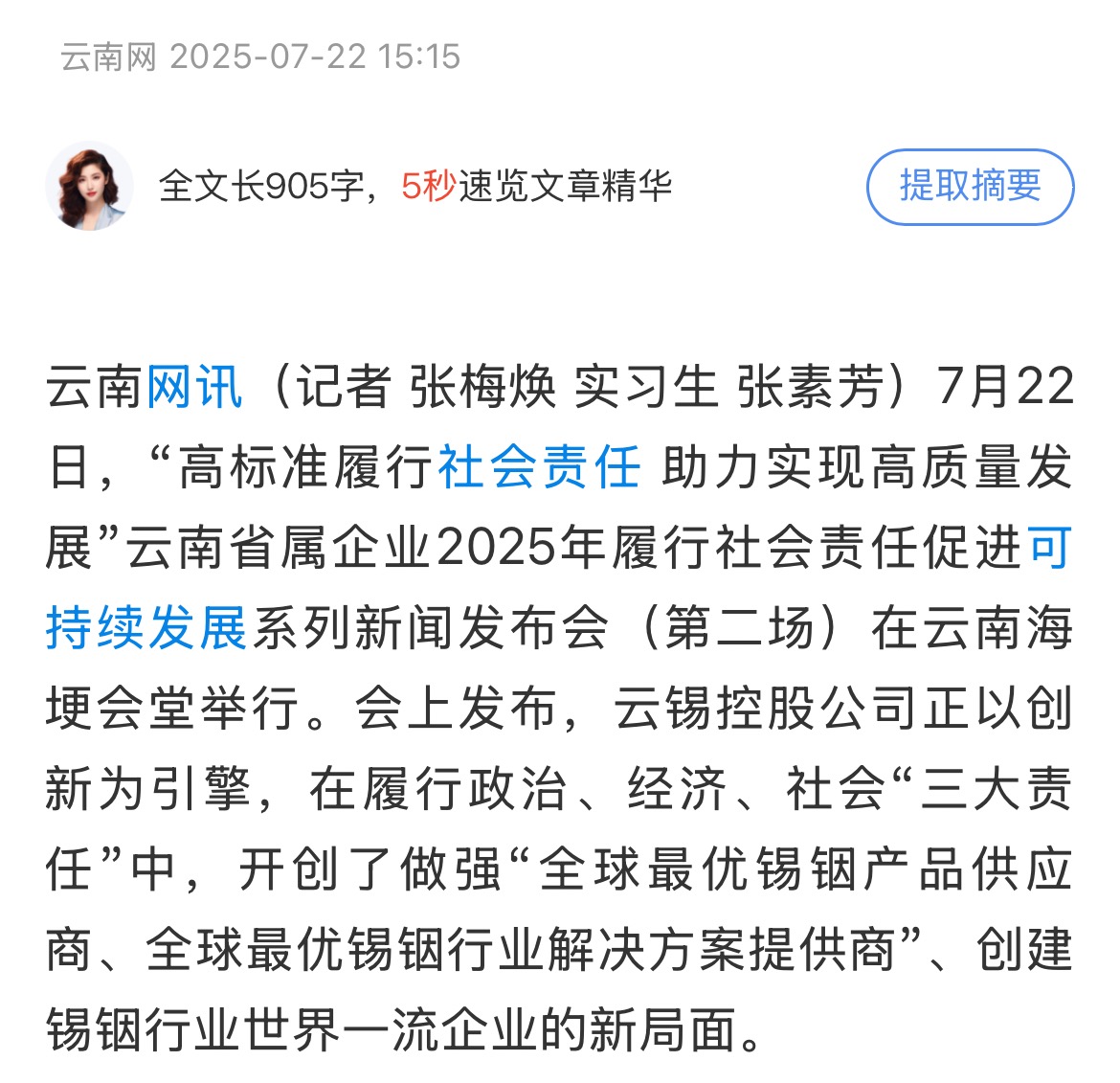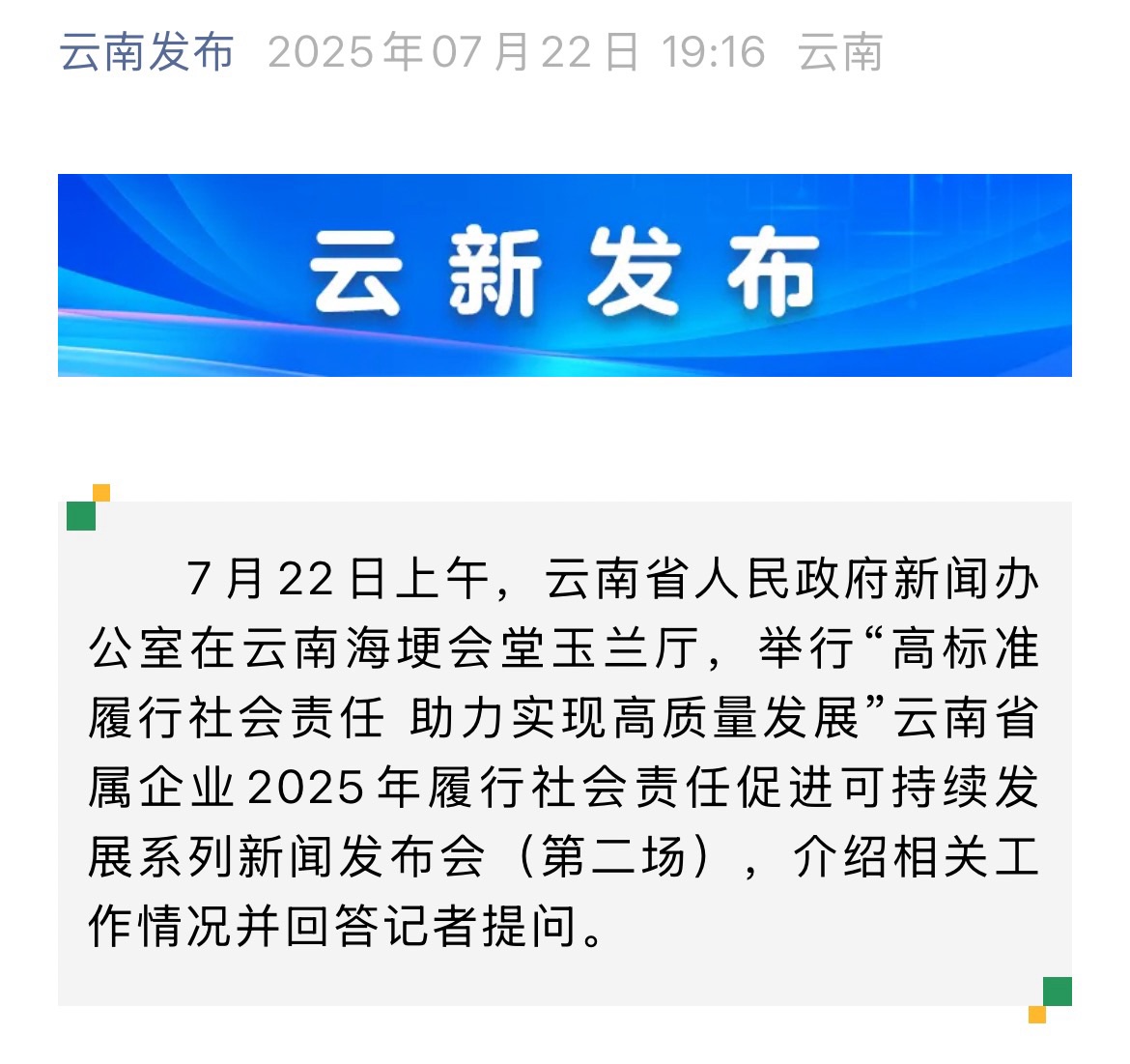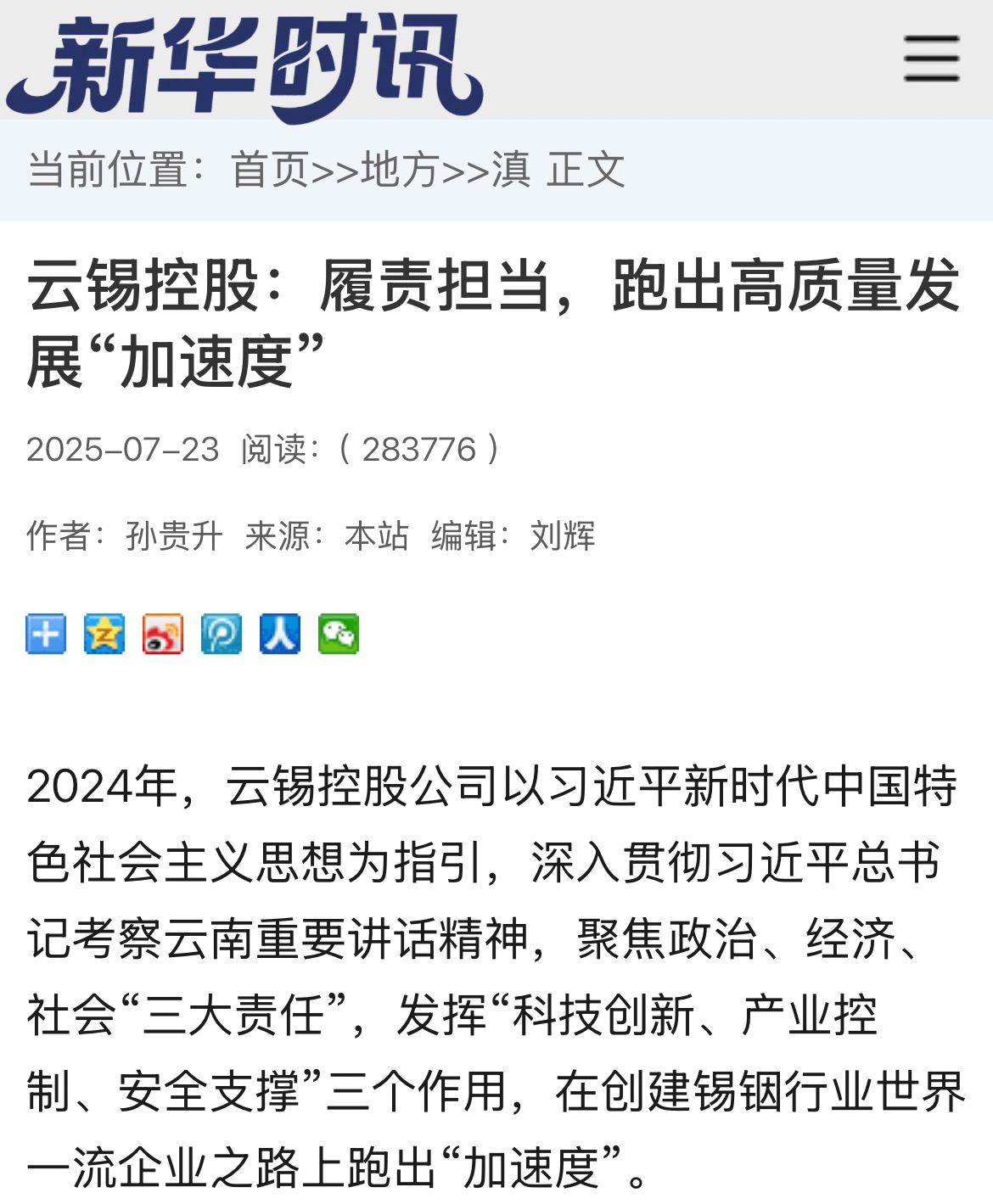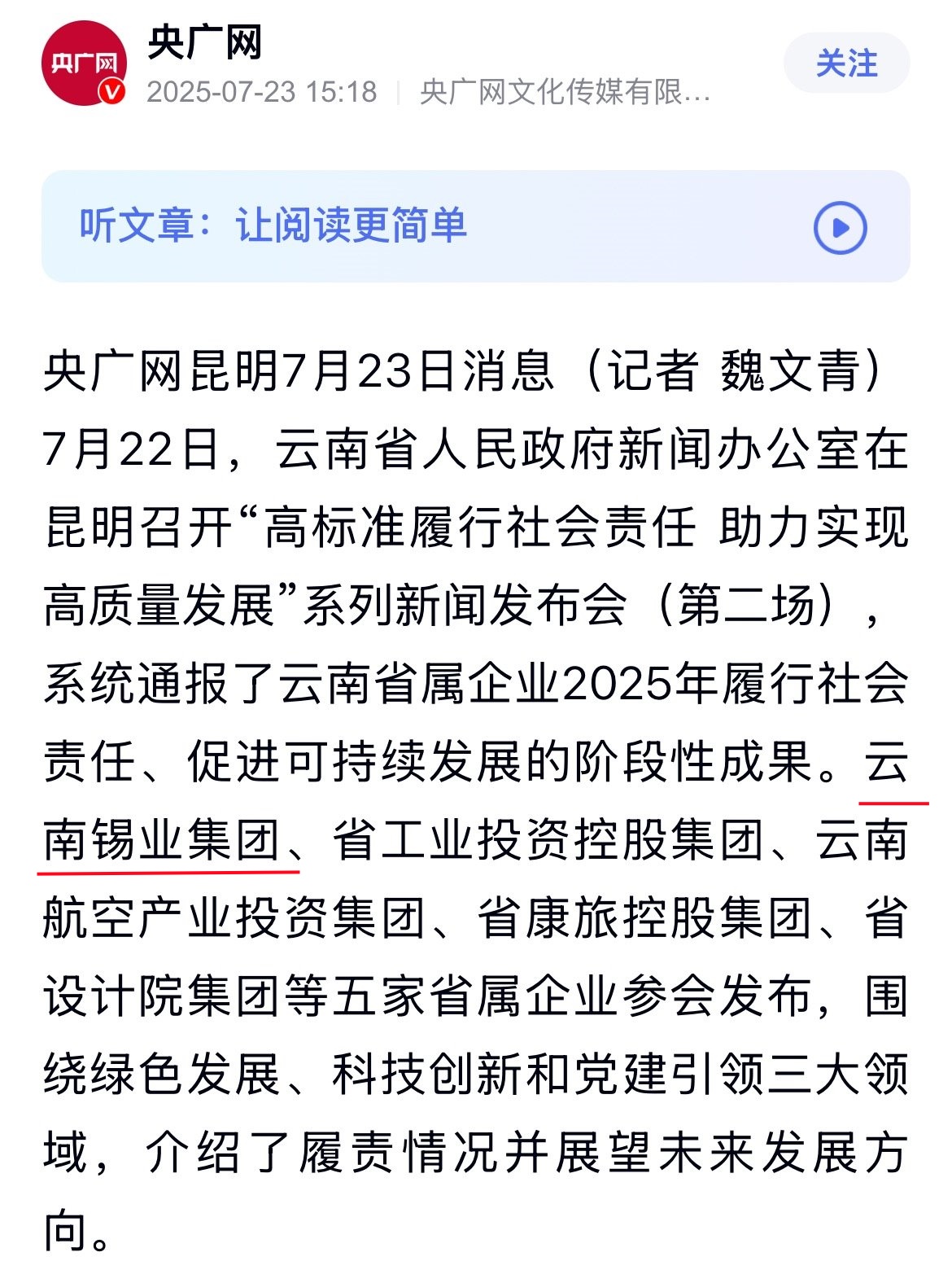 鏈接:(央廣網(wǎng))、(央視影音)、(新華網(wǎng))、(新華時訊)、(中國日報網(wǎng))、(中國新聞網(wǎng))、(中國網(wǎng))(云南新聞聯(lián)播)、(云南衛(wèi)視晚間新聞)、(云南發(fā)布)、(云南日報)、(云南日報-云新聞)、(云南網(wǎng))、(七彩云端)、(云南省人民政府)、(云嶺先鋒網(wǎng))、(云南國資)、(云南政協(xié)報)、(有色金屬報)、(有色新聞)、(騰訊新聞)、(今日頭條)、(搜狐)、(網(wǎng)易)、(新浪微博)、(新浪財經(jīng))、(都市時報)、(國泰君安)、(昆明日報)、(春城晚報)、(昆明信息港)、(開屏新聞)