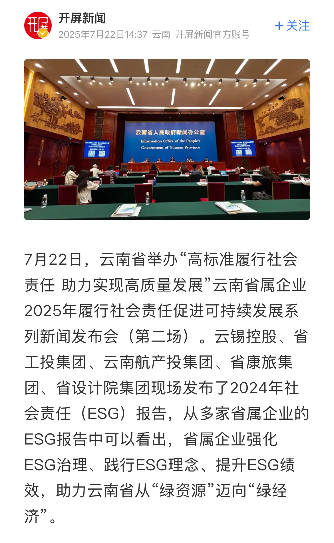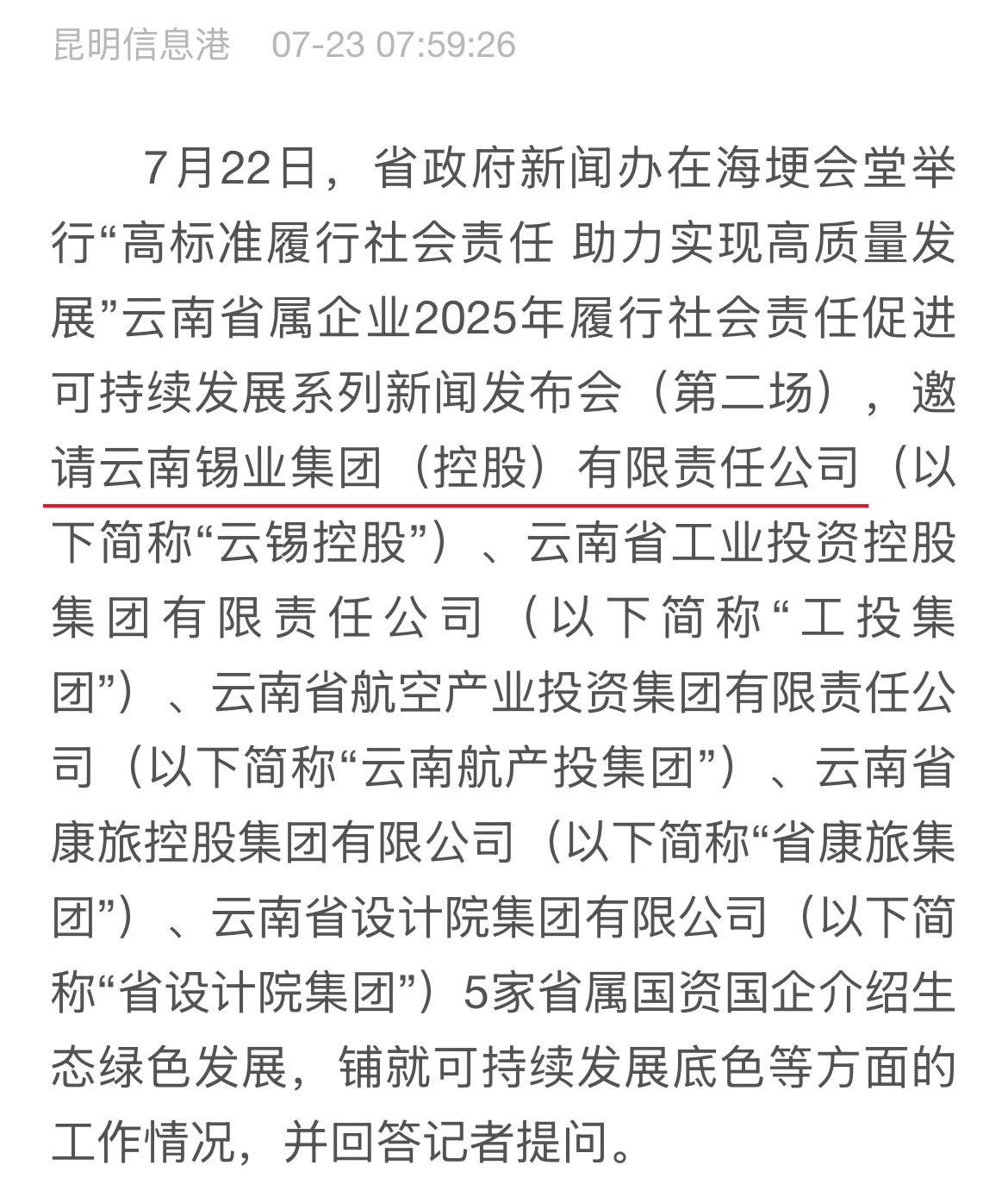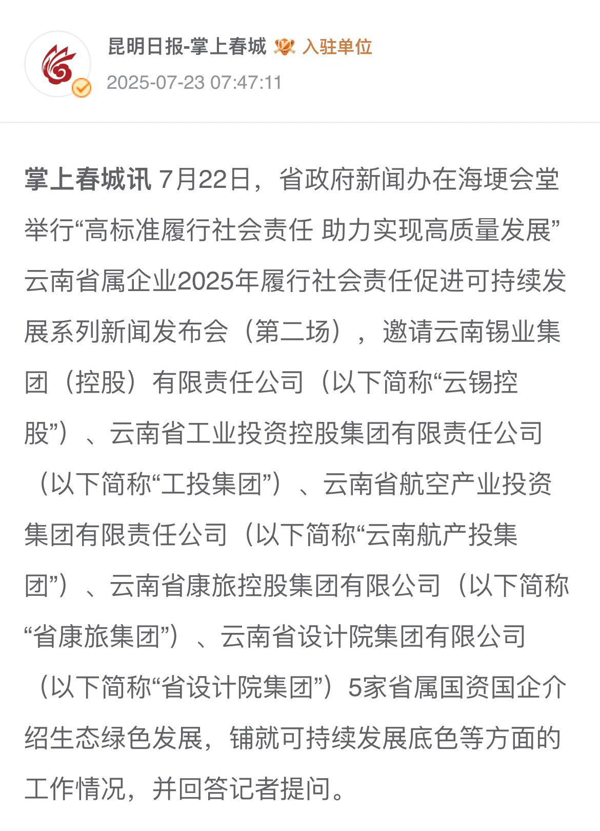 來源:央廣網(wǎng)、央視影音、新華網(wǎng)、新華時訊、中國日報網(wǎng)、中國新聞網(wǎng)、中國網(wǎng)云南新聞聯(lián)播、云南衛(wèi)視晚間新聞、云南發(fā)布、云南日報、云南日報-云新聞、云南網(wǎng)、七彩云端、云南省人民政府、云嶺先鋒網(wǎng)、云南國資、云南政協(xié)報、有色金屬報、有色新聞、騰訊新聞、今日頭條、搜狐、網(wǎng)易、新浪微博、新浪財經(jīng)、都市時報、國泰君安、昆明日報、春城晚報、昆明信息港、開屏新聞