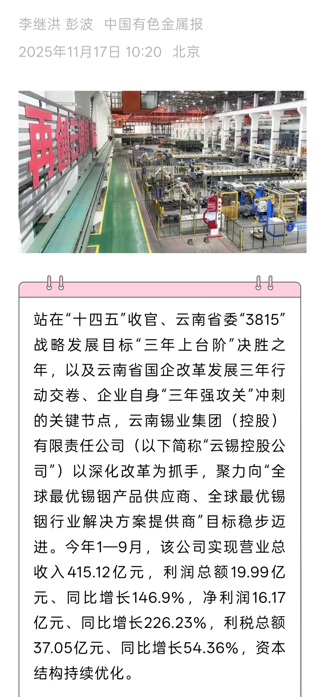 站在“十四五”收官、省委“3815”戰(zhàn)略發(fā)展目標(biāo)“3年上臺(tái)階”決勝之年、全省國(guó)企改革發(fā)展三年行動(dòng)交卷、云錫自身“三年強(qiáng)攻關(guān)”沖刺的關(guān)鍵節(jié)點(diǎn),云南錫業(yè)集團(tuán)(控股)有限責(zé)任公司正以深化改革為抓手,聚力向“全球最優(yōu)錫銦產(chǎn)品供應(yīng)商、全球最優(yōu)錫銦行業(yè)解決方案提供商”穩(wěn)步邁進(jìn)。2025年1至9月,云錫控股實(shí)現(xiàn)營(yíng)業(yè)總收入415.12億元、利潤(rùn)總額19.99億元,同比增長(zhǎng)146.9%;凈利潤(rùn)16.17億元,同比增長(zhǎng)226.23%;利稅總額37.05億元,同比增長(zhǎng)54.36%,資本結(jié)構(gòu)持續(xù)優(yōu)化。