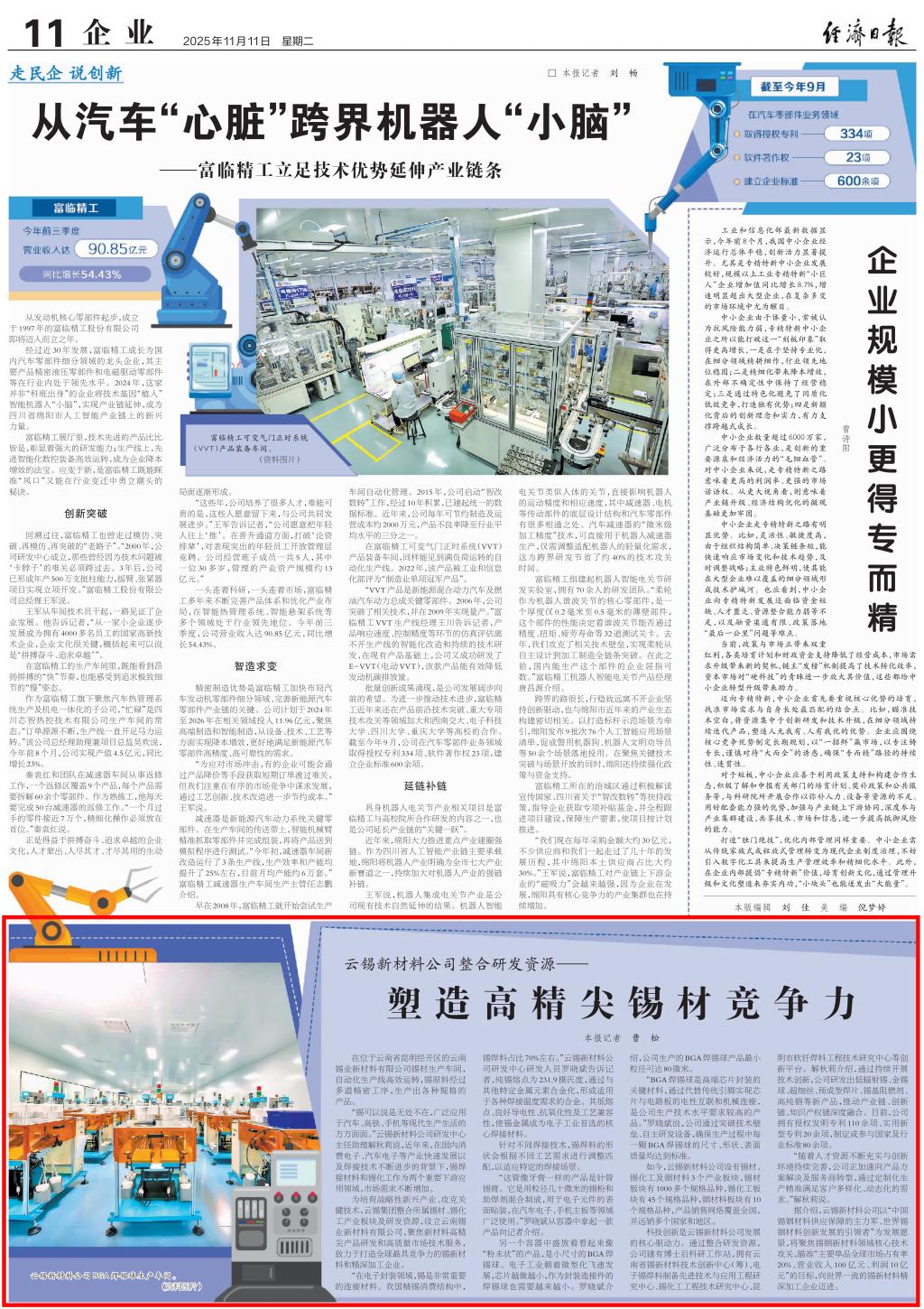 科技創(chuàng)新是云錫新材料公司發(fā)展的核心驅(qū)動(dòng)力。通過整合研發(fā)資源,公司建有博士后科研工作站,擁有云南省錫新材料技術(shù)創(chuàng)新中心(籌)、電子錫焊料制備先進(jìn)技術(shù)與應(yīng)用工程研究中心、錫化工工程技術(shù)研究中心、昆明市軟釬焊料工程技術(shù)研究中心等創(chuàng)新平臺(tái)。解秋莉介紹,通過持續(xù)開展技術(shù)創(chuàng)新,公司研發(fā)出低輻射錫、金錫球、超細(xì)絲、預(yù)成型焊片、錫基阻燃劑、高純銦等新產(chǎn)品,推動(dòng)產(chǎn)業(yè)鏈、創(chuàng)新鏈、知識(shí)產(chǎn)權(quán)鏈深度融合。目前,公司擁有授權(quán)發(fā)明專利110余項(xiàng)、實(shí)用新型專利20余項(xiàng),制定或參與國(guó)家及行業(yè)標(biāo)準(zhǔn)80余項(xiàng)。