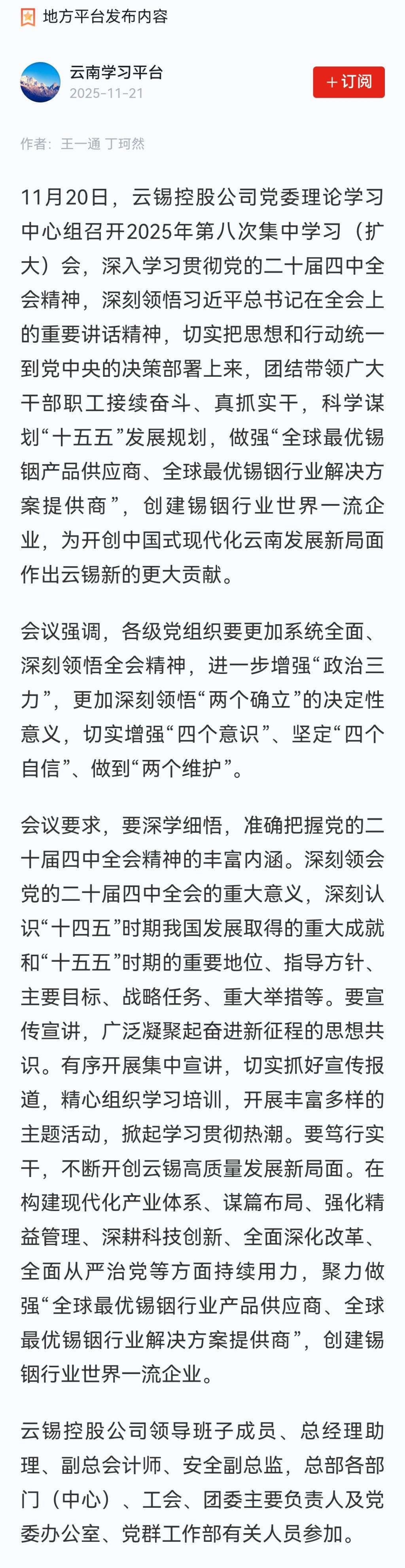 學(xué)習(xí)強國:云錫控股公司黨委理論學(xué)習(xí)中心組專題學(xué)習(xí)黨的二十屆四中全會精神