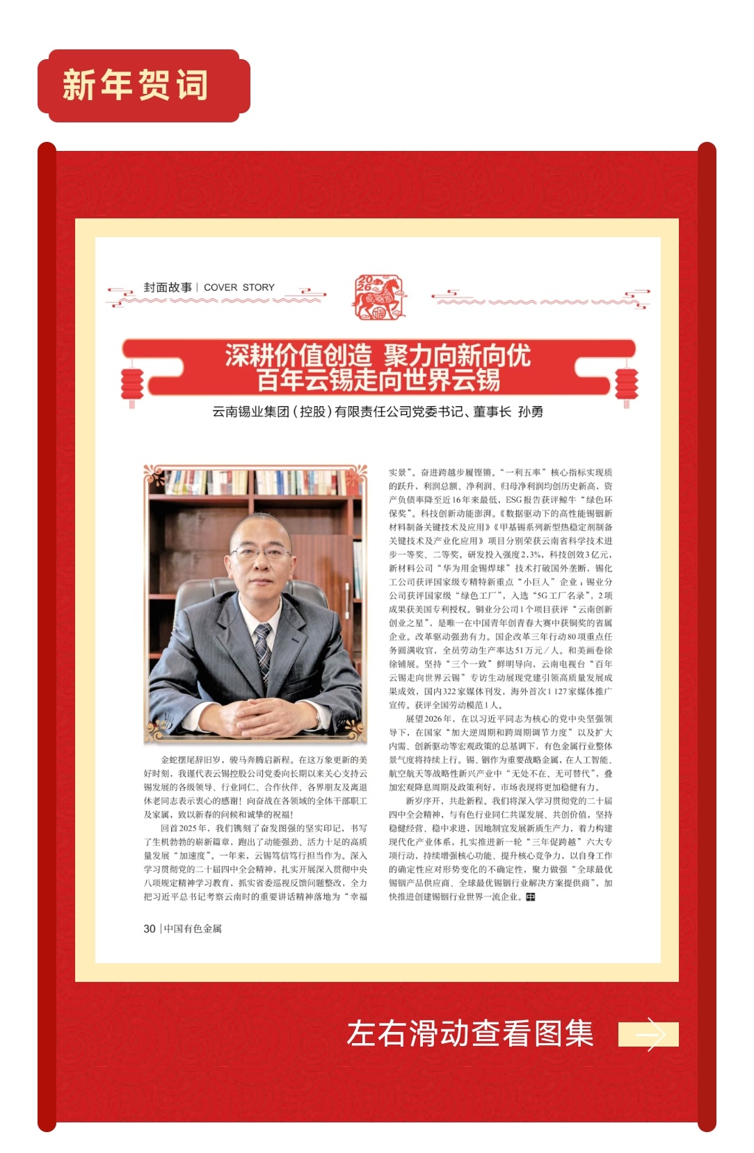 回首2025年,我們鐫刻了奮發(fā)圖強(qiáng)的堅(jiān)實(shí)印記,書寫了生機(jī)勃勃的嶄新篇章,跑出了動能強(qiáng)勁、活力十足的高質(zhì)量發(fā)展“加速度”。一年來,云錫篤信篤行擔(dān)當(dāng)作為。深入學(xué)習(xí)貫徹黨的二十屆四中全會精神,扎實(shí)開展深入貫徹中央八項(xiàng)規(guī)定精神學(xué)習(xí)教育,抓實(shí)省委巡視反饋問題整改,全力把習(xí)近平總書記考察云南重要講話精神落地為“幸福實(shí)景”,處處回蕩著“凝心鑄魂強(qiáng)黨性 勇毅前行建新功”實(shí)干強(qiáng)音。奮進(jìn)跨越步履鏗鏘。“一利五率”核心指標(biāo)實(shí)現(xiàn)質(zhì)的躍升,利潤總額、凈利潤、歸母凈利潤均創(chuàng)歷史新高,資產(chǎn)負(fù)債率降至近16年來最低,ESG報告獲評鯨牛“綠色環(huán)保獎”。科技創(chuàng)新動能澎湃。《數(shù)據(jù)驅(qū)動下的高性能錫銦新材料制備關(guān)鍵技術(shù)及應(yīng)用》《甲基錫系列新型熱穩(wěn)定劑制備關(guān)鍵技術(shù)及產(chǎn)業(yè)化應(yīng)用》項(xiàng)目分別擬獲評云南省科學(xué)技術(shù)進(jìn)步一等獎、二等獎。研發(fā)投入強(qiáng)度2.3%,科技創(chuàng)效3億元,新材料公司“華為用金錫焊球”打破國外壟斷,錫化工公司獲評國家級“專精特新重點(diǎn)‘小巨人’企業(yè)”;錫業(yè)分公司獲評國家級“綠色工廠”,入選“5G工廠名錄”,2項(xiàng)成果獲美國專利授權(quán)。銅業(yè)分公司1個項(xiàng)目獲評“云南創(chuàng)新創(chuàng)業(yè)之星”,是唯一在中國青年創(chuàng)青春大賽中獲銅獎的省屬企業(yè)。改革驅(qū)動強(qiáng)勁有力。國企改革三年行動80項(xiàng)重點(diǎn)任務(wù)圓滿收官,全員勞動生產(chǎn)率達(dá)51萬元/人。和美畫卷徐徐鋪展。堅(jiān)持“三個一致”鮮明導(dǎo)向,云南電視臺“百年云錫走向世界云錫”專訪生動展現(xiàn)黨建引領(lǐng)高質(zhì)量發(fā)展成果成效,國內(nèi)322家媒體刊發(fā),海外首次1127家媒體推廣宣傳。獲評全國勞動模范1人。
