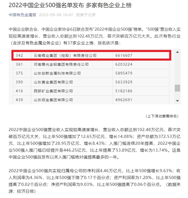 9月6日,中國(guó)企業(yè)聯(lián)合會(huì)、中國(guó)企業(yè)家協(xié)會(huì)聯(lián)合發(fā)布“2022中國(guó)企業(yè)500強(qiáng)”榜單。云錫控股公司以營(yíng)收661.66億元的業(yè)績(jī),排名第342位。