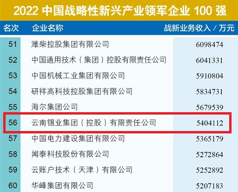 9月6日,中國企業(yè)聯(lián)合會、中國企業(yè)家協(xié)會(簡稱中國企聯(lián))在京舉辦新聞發(fā)布會,發(fā)布了“中國戰(zhàn)略新興產(chǎn)業(yè)領(lǐng)軍企業(yè)100強”榜單。云錫控股公司以戰(zhàn)新業(yè)務(wù)收入540.41億元的業(yè)績,排名第56位。