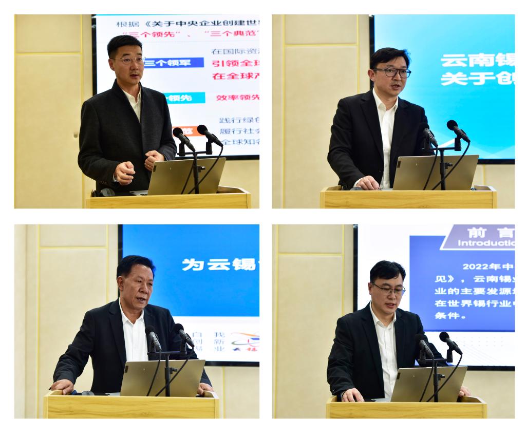 控股公司戰(zhàn)略管理部匯報前期工作進展、基礎條件和相關政策解讀;控股公司財務管理部、投資管理部、組織人事部、創(chuàng)新&數(shù)字化中心、錫業(yè)股份、研究院公司(研發(fā)中心)、物流公司圍繞如何創(chuàng)建世界一流企業(yè)分別發(fā)言。