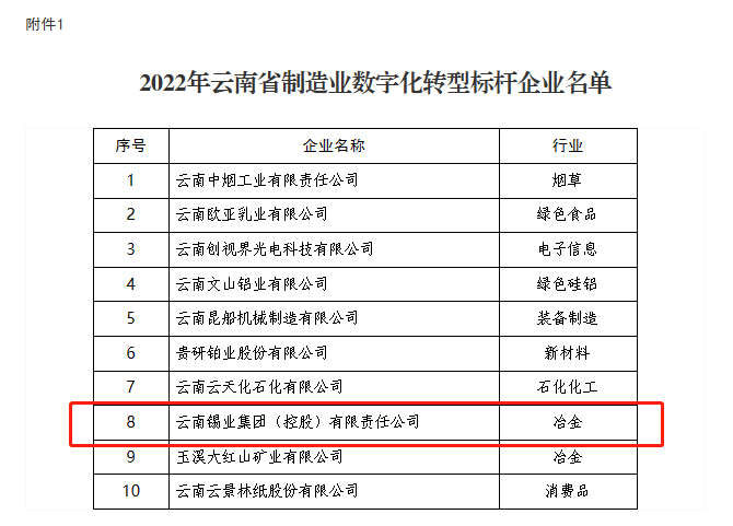 為加快推進(jìn)新一代信息技術(shù)和制造業(yè)融合發(fā)展,加快發(fā)展先進(jìn)制造業(yè),實(shí)現(xiàn)產(chǎn)業(yè)強(qiáng)省,省委、省政府決定每年打造10個(gè)制造業(yè)數(shù)字化轉(zhuǎn)型標(biāo)桿企業(yè),培育“數(shù)字領(lǐng)航”企業(yè),引領(lǐng)和推動制造業(yè)數(shù)字化轉(zhuǎn)型升級。2022年,由省工信廳牽頭組織開展了“2022年數(shù)字化轉(zhuǎn)型標(biāo)桿企業(yè)”評選工作,經(jīng)企業(yè)自主申報(bào)、州(市)工信部門初審和推薦、專家評審、現(xiàn)場調(diào)研、線上答辯、意見征求、名單公示等程序,云南錫業(yè)集團(tuán)(控股)有限責(zé)任公司成功入選云南省2022年制造業(yè)數(shù)字化轉(zhuǎn)型標(biāo)桿企業(yè)。