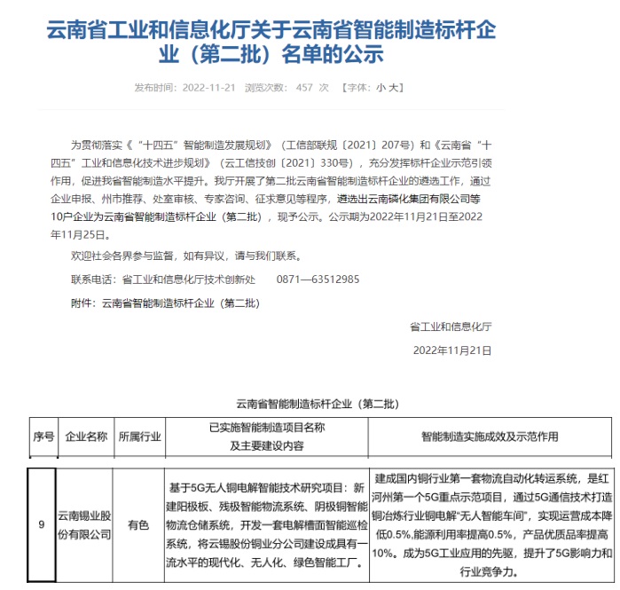 近日,云南省工業(yè)和信息化廳發(fā)布了云南省智能制造標(biāo)桿企業(yè)(第二批)名單,共遴選10家企業(yè),錫業(yè)股份成功入選。