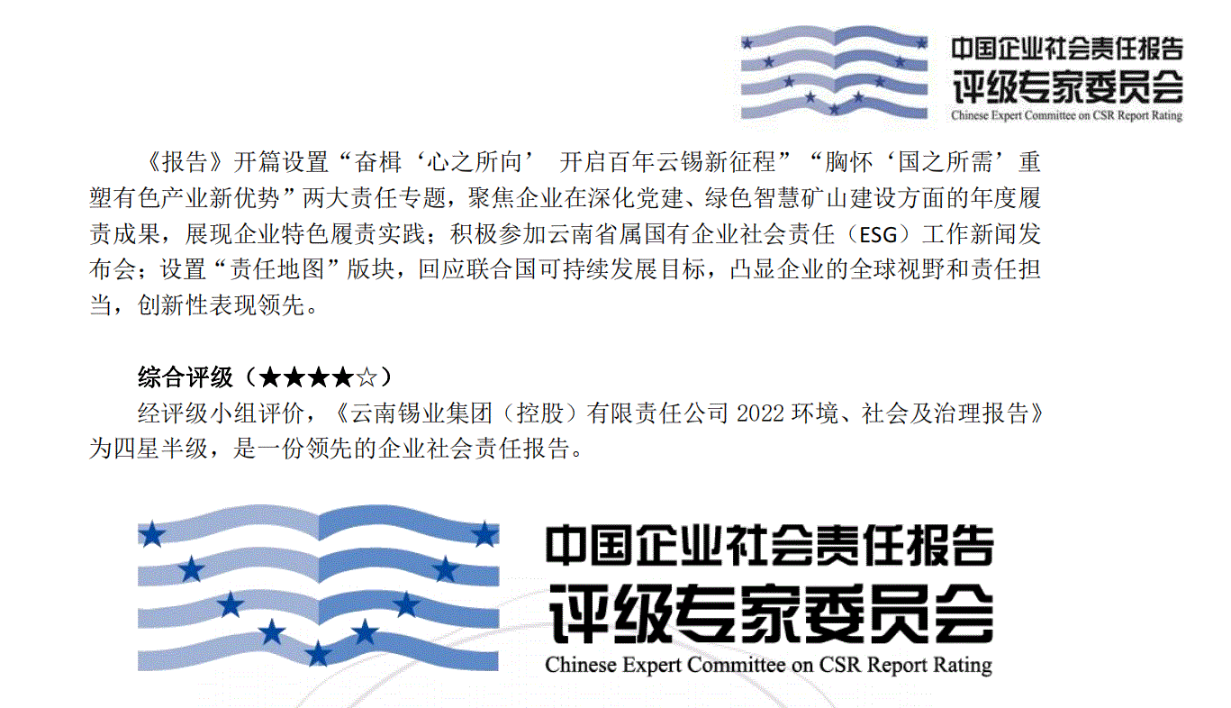 近日,中國企業(yè)社會責(zé)任報(bào)告評級專家委員會發(fā)布評級結(jié)果,《云南錫業(yè)集團(tuán)(控股) 有限責(zé)任公司2022環(huán)境、社會及治理報(bào)告》首次參評即獲“四星半級”,被綜合評定為“是一份領(lǐng)先的企業(yè)社會責(zé)任報(bào)告”。目前,云南省屬企業(yè)僅有2家獲得“四星半級”認(rèn)定,凸顯了云錫在公司治理、責(zé)任管理等方面的領(lǐng)先優(yōu)勢。