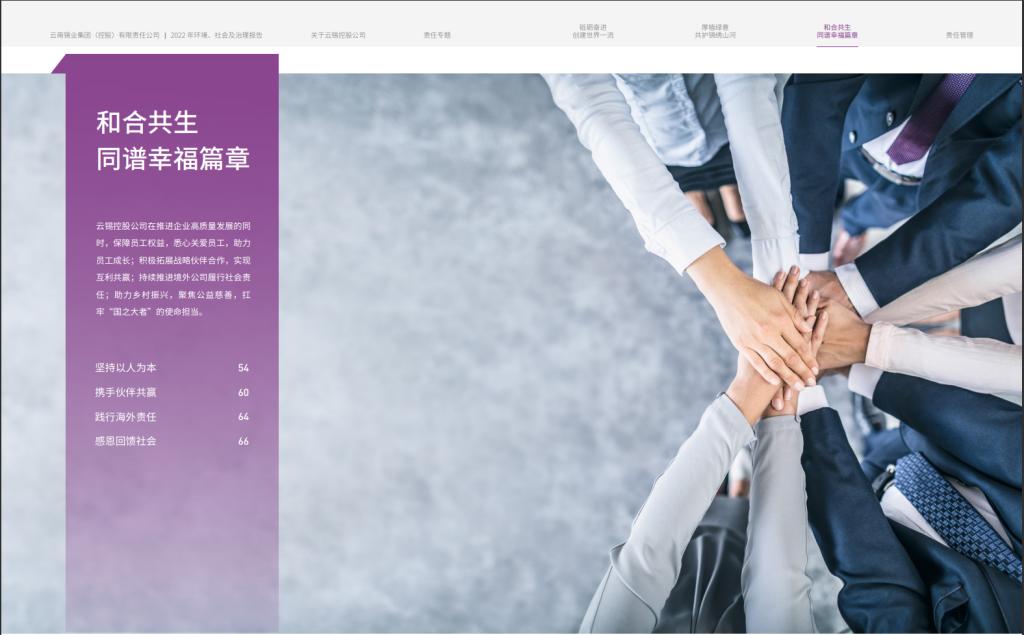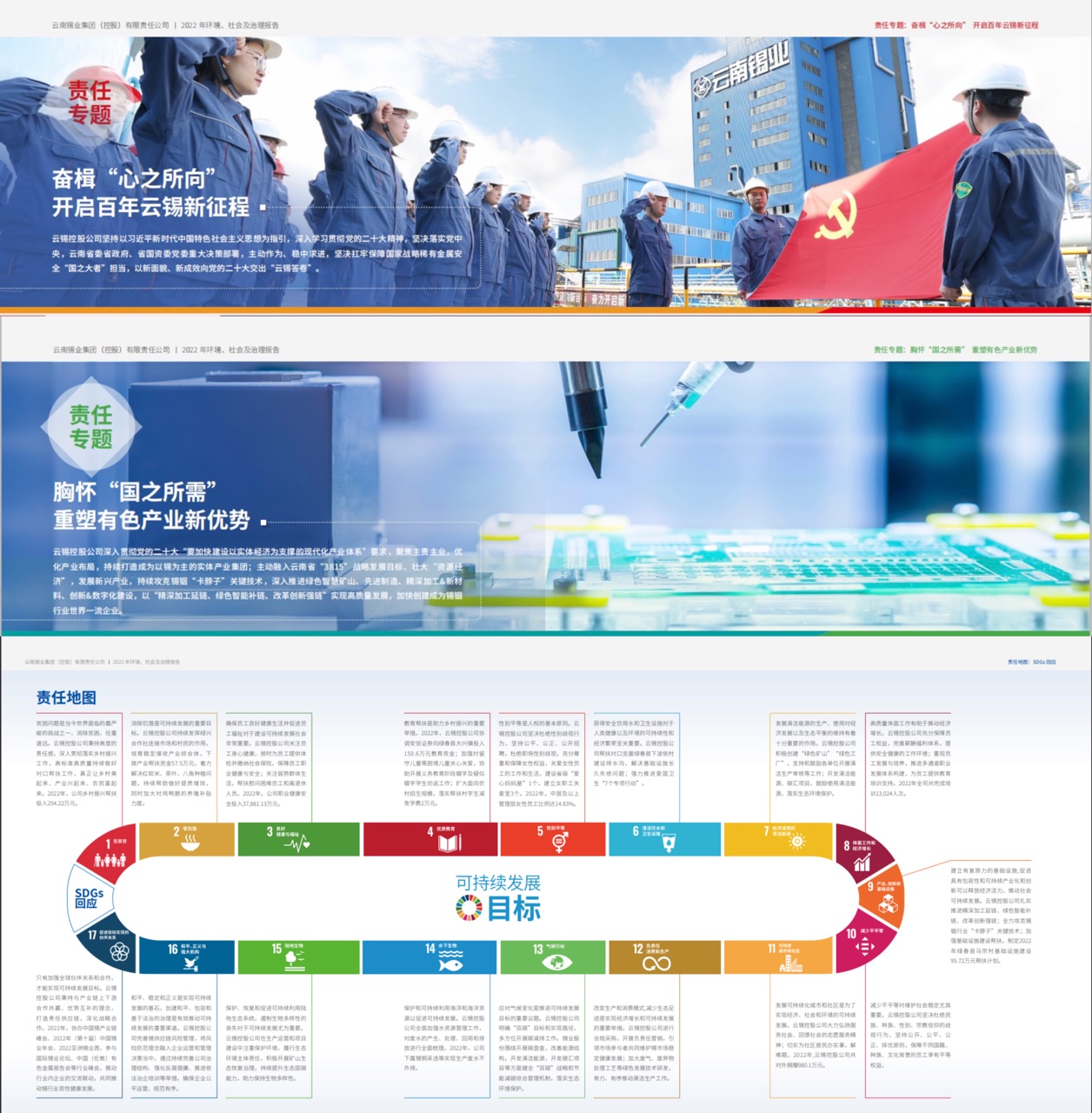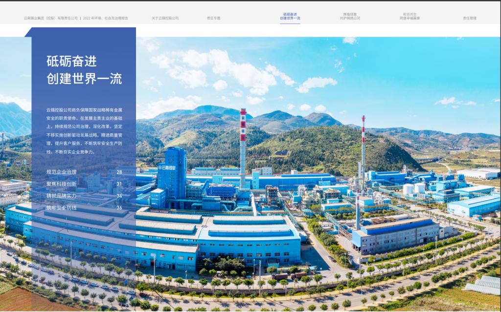 報(bào)告以“云聚眾智 錫濟(jì)天下”的企業(yè)精神和責(zé)任理念為統(tǒng)領(lǐng),通過“奮楫‘心之所向’ 開啟百年云錫新征程”“胸懷‘國之所需’重塑有色產(chǎn)業(yè)新優(yōu)勢”兩大責(zé)任專題,高度凝練展示云錫在深化黨建引領(lǐng)、綠色創(chuàng)新發(fā)展、踐行產(chǎn)業(yè)報(bào)國等方面的特色履責(zé)實(shí)踐。通過設(shè)置“責(zé)任地圖”版塊,回應(yīng)聯(lián)合國可持續(xù)發(fā)展目標(biāo),凸顯企業(yè)的全球視野和責(zé)任擔(dān)當(dāng)。