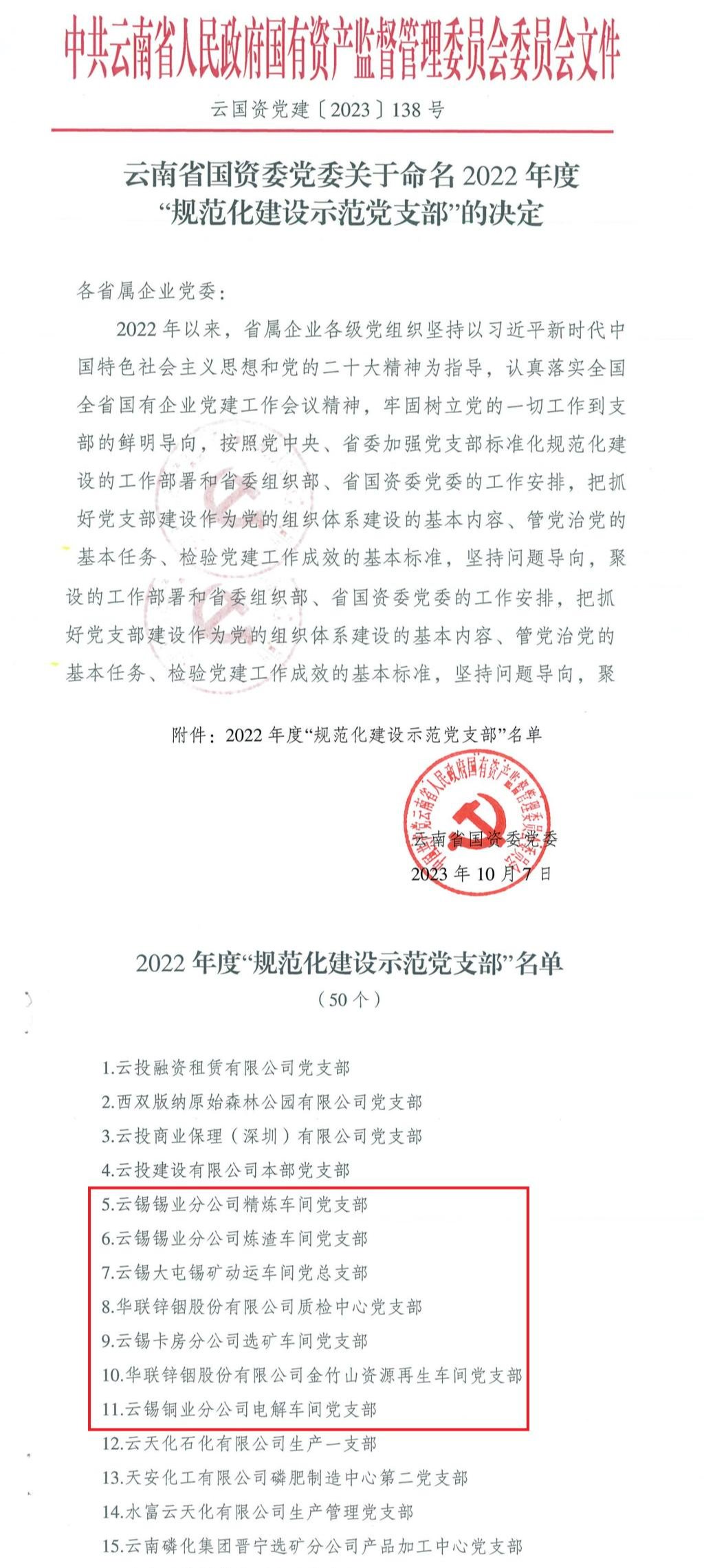 近日,省國資委黨委下發(fā)關(guān)于命名2022年度“規(guī)范化建設(shè)示范黨支部”的決定,命名50個黨支部為“規(guī)范化建設(shè)示范黨支部”,其中,云錫錫業(yè)分公司精煉車間等7個黨支部獲得命名。