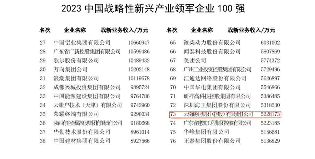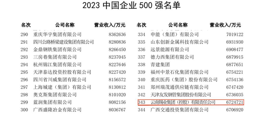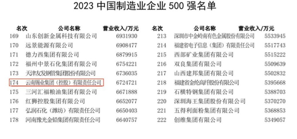 近日,中國企業(yè)聯(lián)合會、中國企業(yè)家協(xié)會聯(lián)合發(fā)布“2023中國企業(yè)500強”榜單。云錫位列2023年中國企業(yè)500強第343位,中國制造業(yè)企業(yè)500強第174位,中國戰(zhàn)略性新興產(chǎn)業(yè)領(lǐng)軍企業(yè)100強73位。在中國有色金屬工業(yè)協(xié)會發(fā)布的2022年有色金屬企業(yè)50強榜單中,云錫位列第24位。