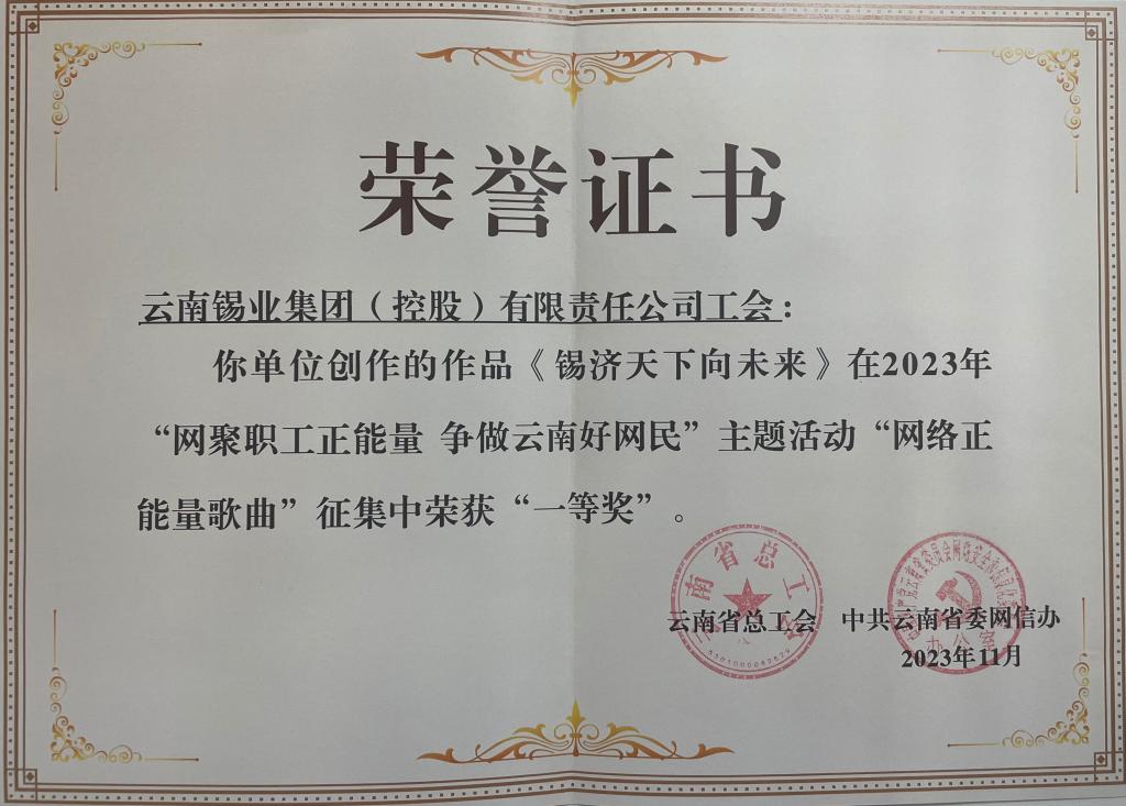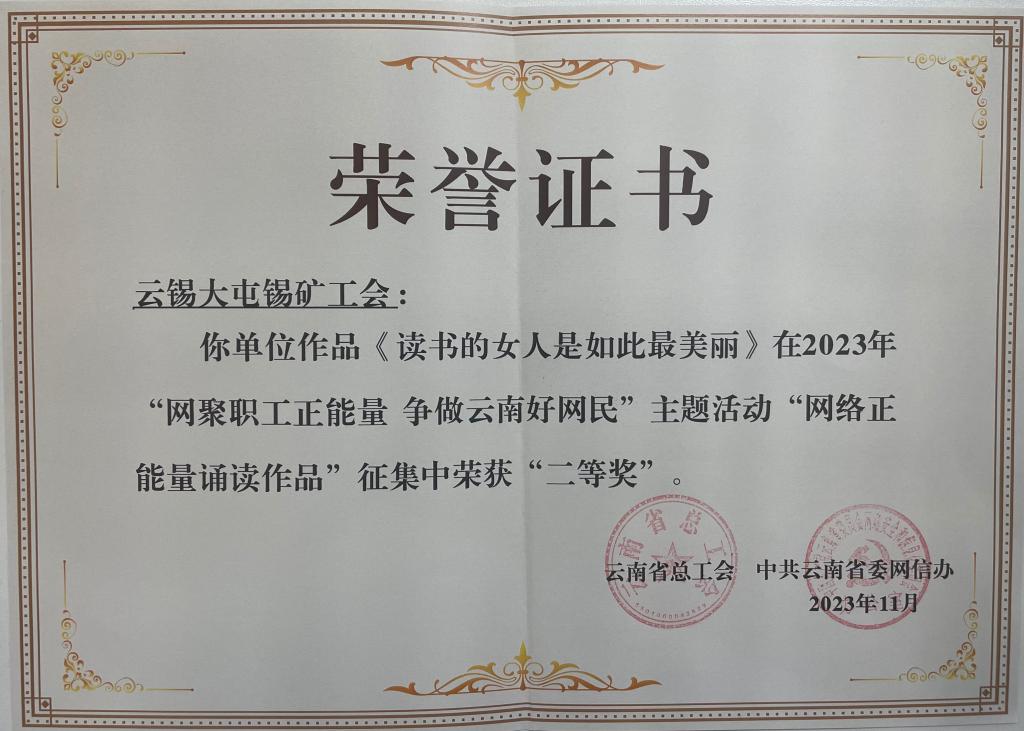 在本次主題活動中,云錫公司工會選送的原創(chuàng)歌曲MV《錫濟天下向未來》榮獲網(wǎng)絡(luò)正能量優(yōu)秀歌曲一等獎,選送的大屯錫礦誦讀作品《讀書的女人是如此最美麗》榮獲網(wǎng)絡(luò)正能量優(yōu)秀誦讀二等獎,誦讀作品《錫山薔薇》、微視頻作品《屈子望》、攝影作品《晨掃女工》分別獲得優(yōu)秀獎,云錫控股公司工會榮獲優(yōu)秀組織獎。