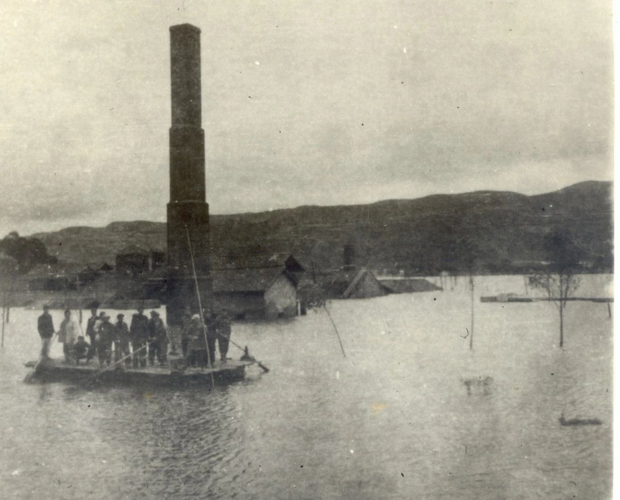 洪水淹沒(méi)個(gè)舊煉廠后,煉錫工人打撈設(shè)備。