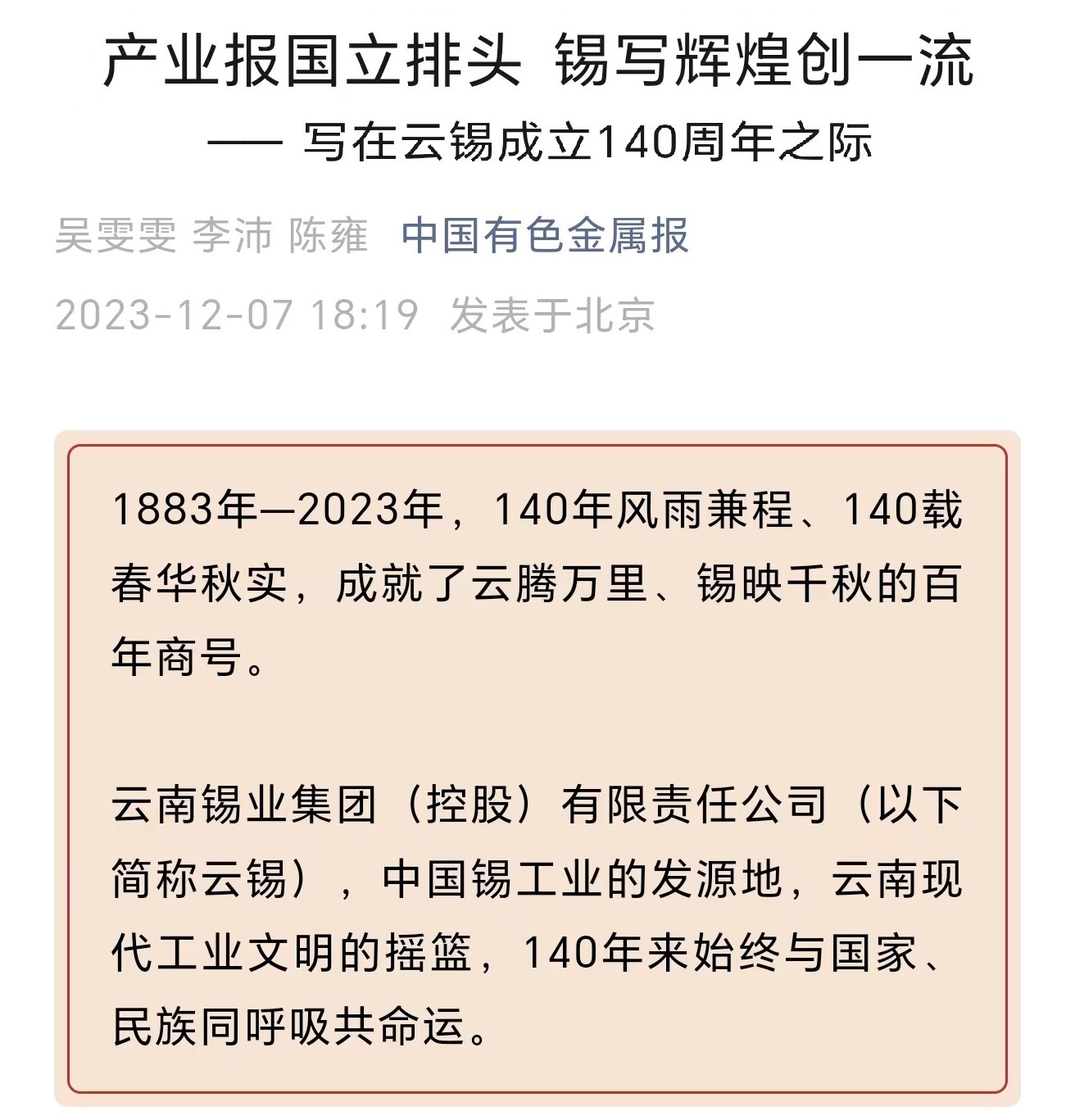 近日,中國(guó)有色金屬報(bào)頭條刊發(fā)《產(chǎn)業(yè)報(bào)國(guó)立排頭 錫寫(xiě)輝煌創(chuàng)一流——寫(xiě)在云錫成立140周年之際》,全面展現(xiàn)百年云錫波瀾壯闊的歷史跨越。
