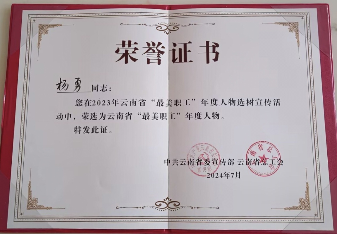 喜報(bào)傳佳音,奮楫正當(dāng)時(shí)。7月15日,省委宣傳部、省總工會(huì)在云南廣播電視臺(tái)舉行云南省“最美職工”年度人物發(fā)布儀式,發(fā)布2023年云南省“最美職工”年度人物先進(jìn)事跡。老廠分公司職工楊勇光榮在榜。