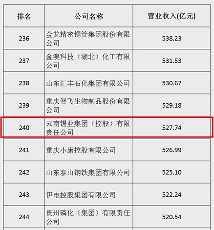 日前,中國企業(yè)聯(lián)合會、中國企業(yè)家協(xié)會聯(lián)合發(fā)布2024中國企業(yè)500強、中國制造業(yè)企業(yè)500強榜單。云錫位列2024中國企業(yè)500強第458位、中國制造業(yè)企業(yè)500強第240位。