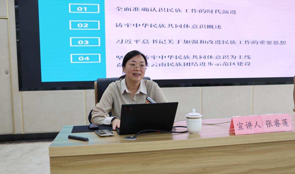 會(huì)議邀請(qǐng)?jiān)颇鲜∩鐣?huì)科學(xué)院研究員、鑄牢中華民族共同體意識(shí)宣講團(tuán)成員張睿蓮,圍繞“鑄牢中華民族共同體意識(shí) 推進(jìn)新時(shí)代黨的民族工作高質(zhì)量發(fā)展”主題,進(jìn)行了深入淺出、精辟透徹的宣講。