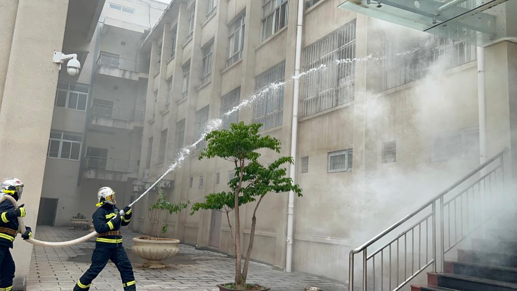隨著演練模擬的火災(zāi)煙霧開始蔓延,演練人員方案的要求按滅火行動組、通訊聯(lián)絡(luò)組、疏散引導(dǎo)組、安全救護(hù)組、安全警戒組、宣傳運(yùn)輸保障組分工協(xié)作,保證了科技樓疏散人員用毛巾掩住口鼻,沿預(yù)定路線有序撤離,火災(zāi)得以及時撲滅。
